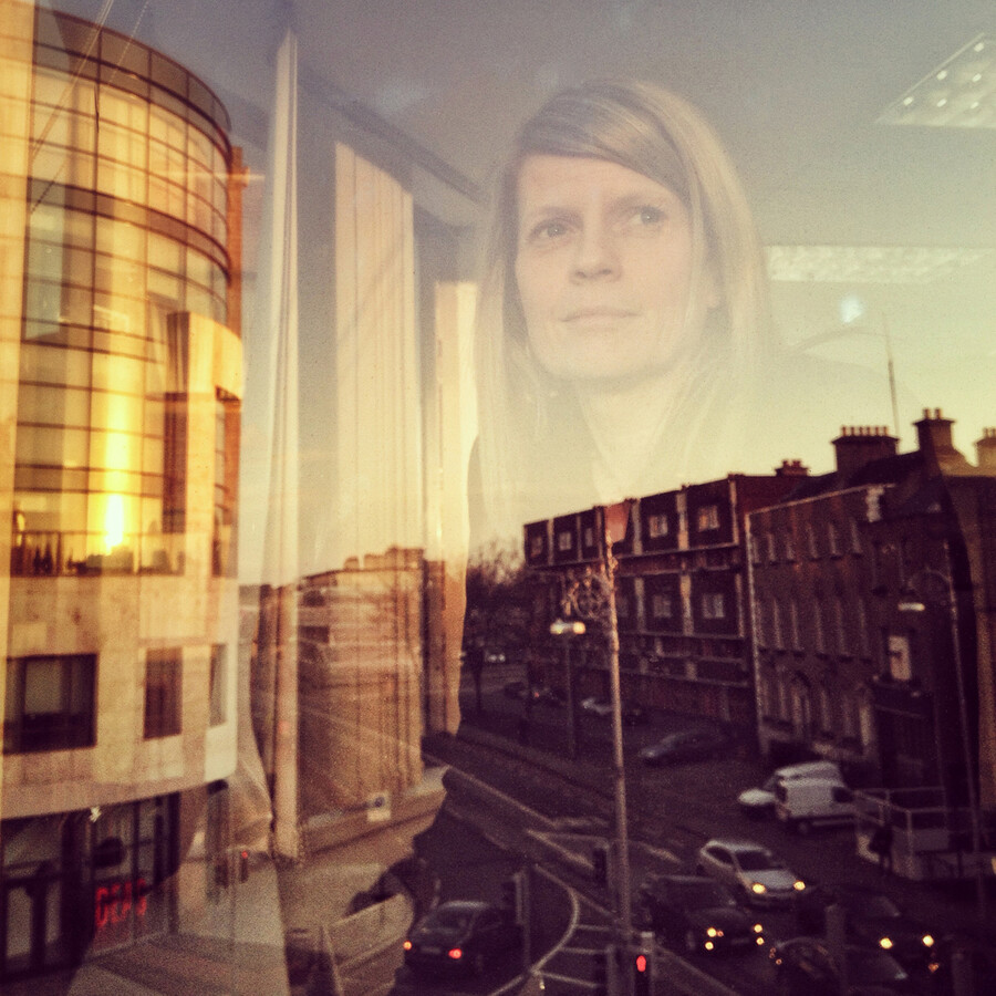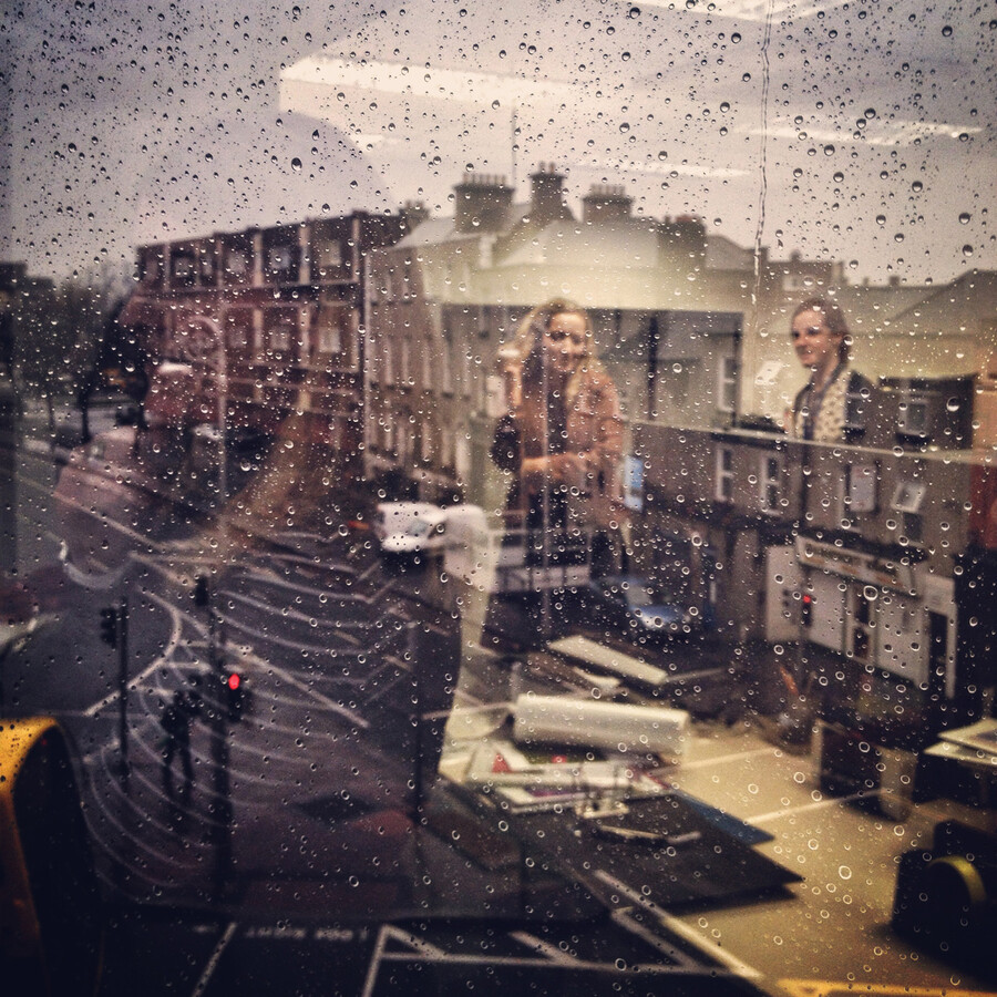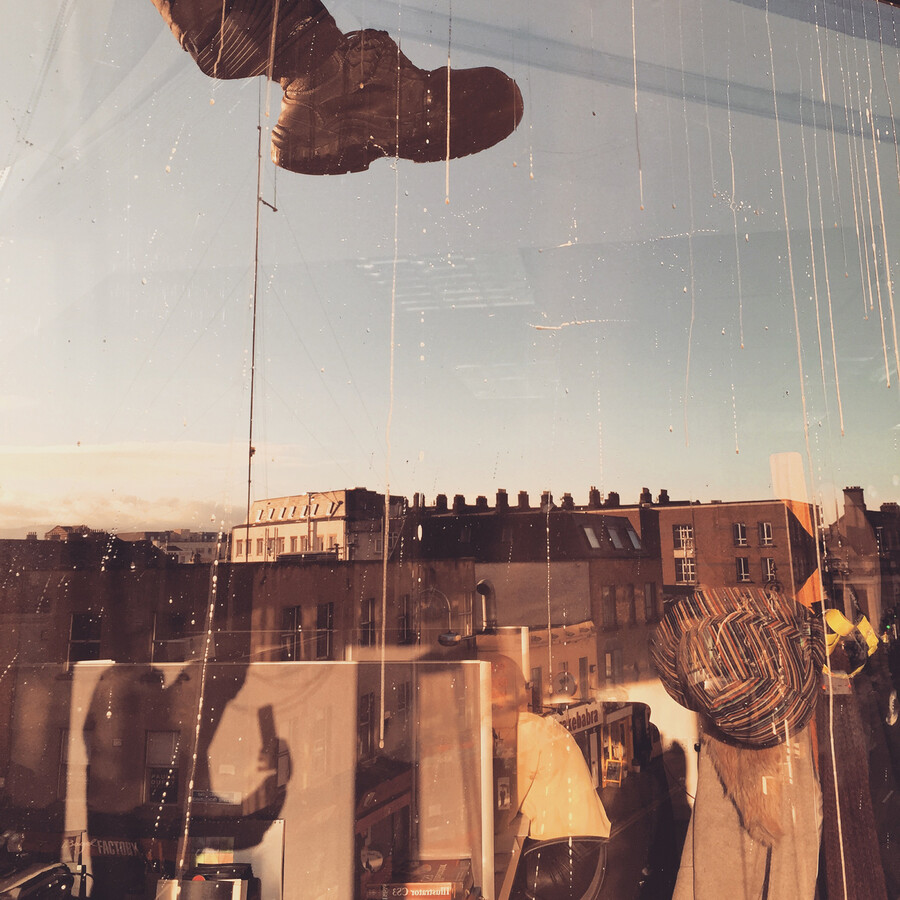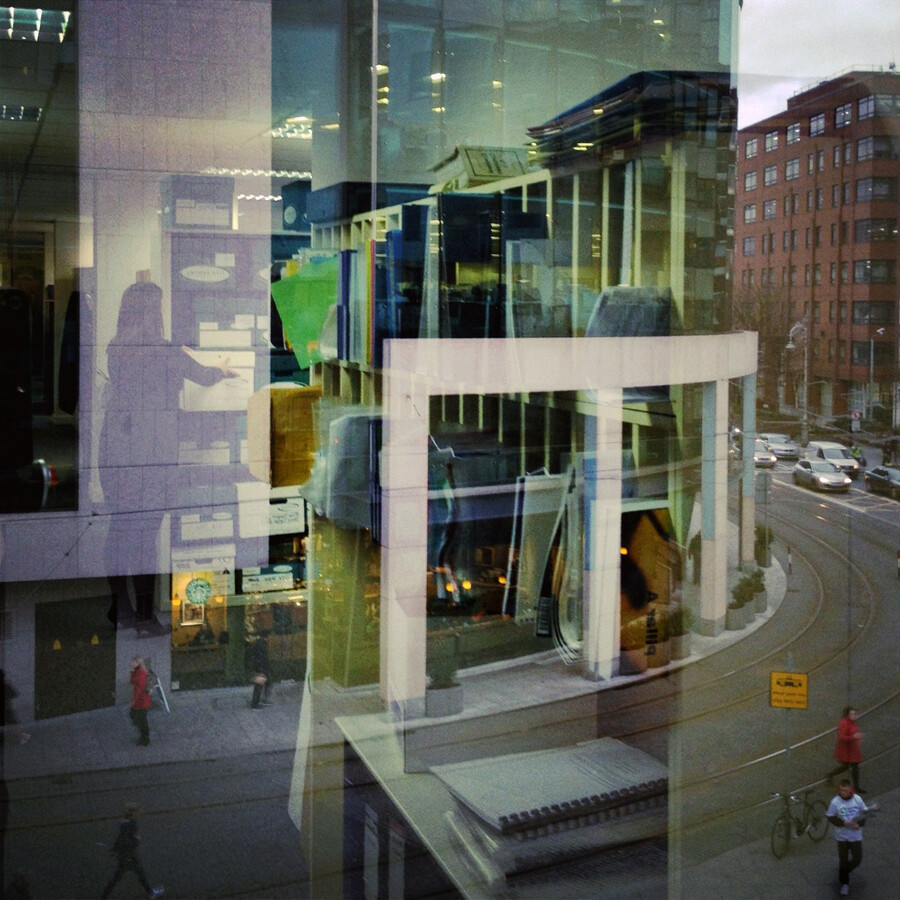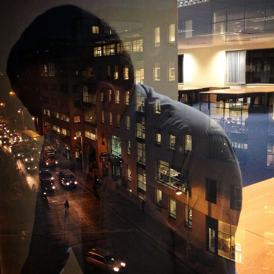 I work part-time in a corporate office that has some windows with mirrored glass. These windows reflect the internal office space and the street outside, creating a double effect that changes depending on the weather and the time of day. I find sunsets or dark, cloudy days the most effective for getting this double reaction.