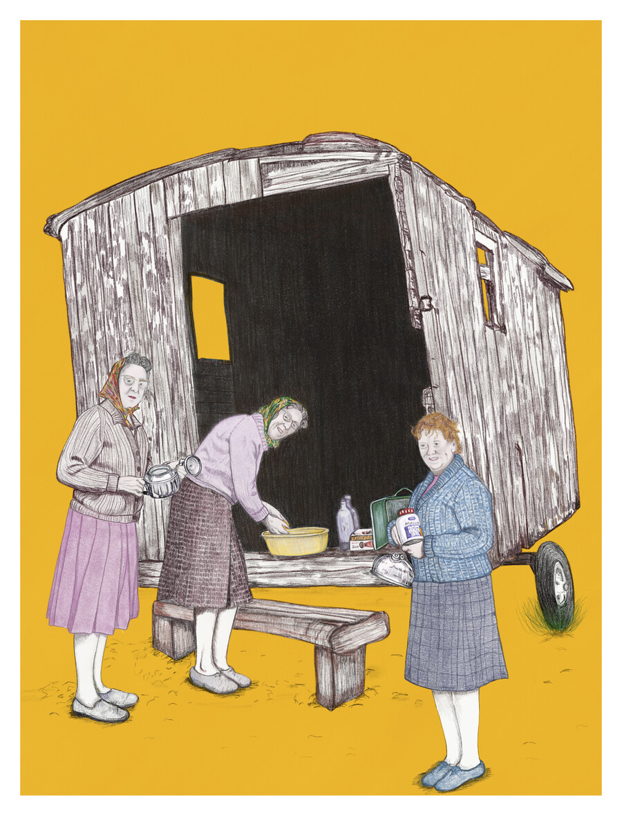 These drawings are influenced by a selection depicting a group of elderly people on day trips. Having regular pitstops by the sea and endless cups of tea and sandwiches appear out of nowhere. I think these photos are from around the mid-1960s or so by their style. These people are strangers, but I feel a connection to them and that era. It was just before I was born. They make me nostalgic as they are so similar to my Grandparents' images, the same style of clothes and cars. Things seem so much more effortless than today. Everyone looks so happy and relaxed.