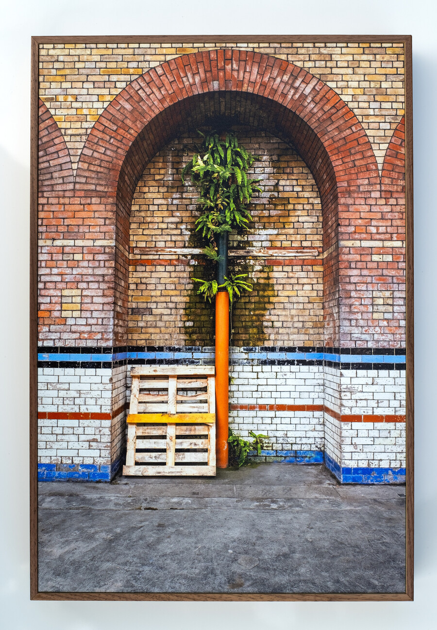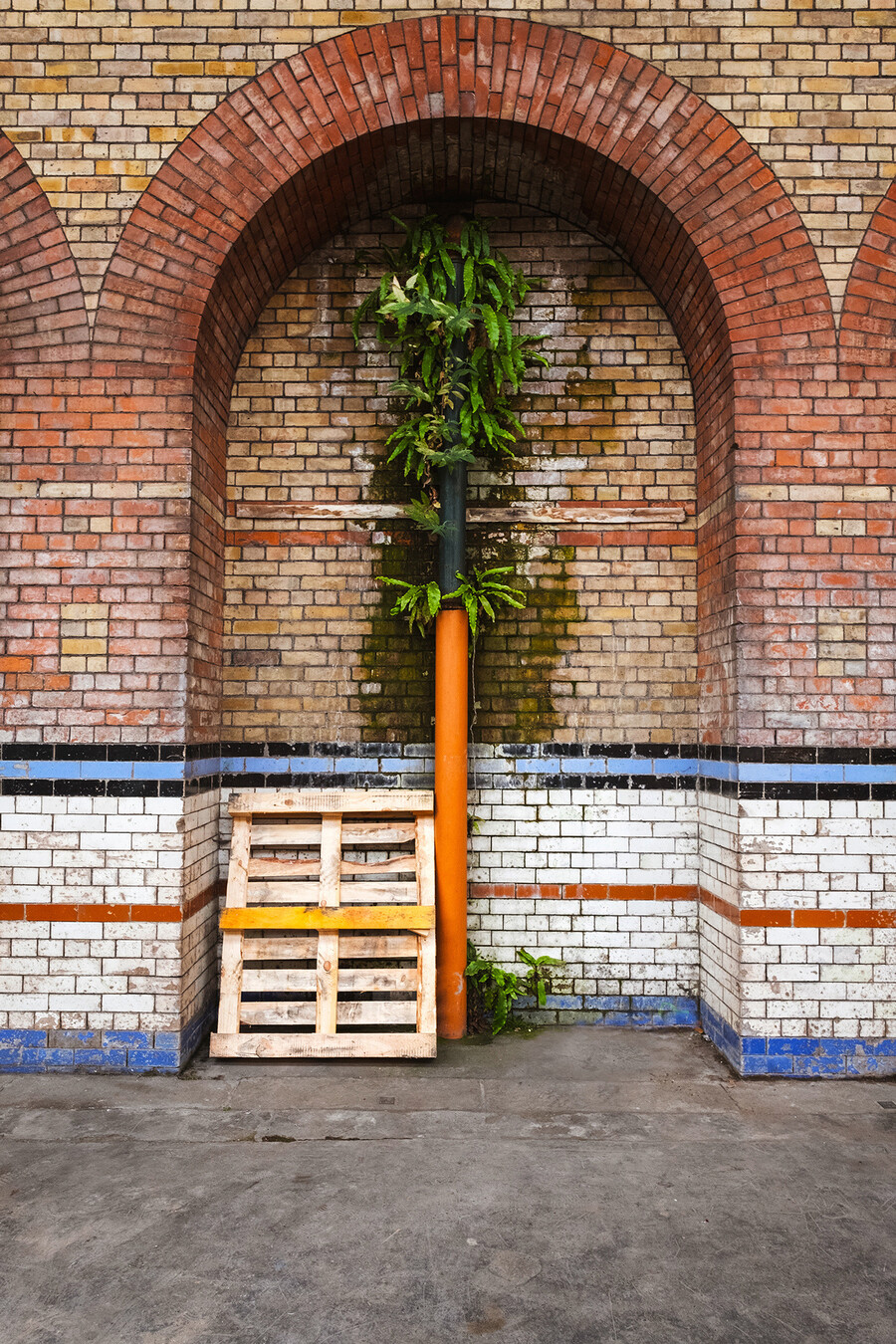 Nature fights back as a plant grows up through this neglected pipe forming what looks like a palm tree within this beautiful bricked arch.