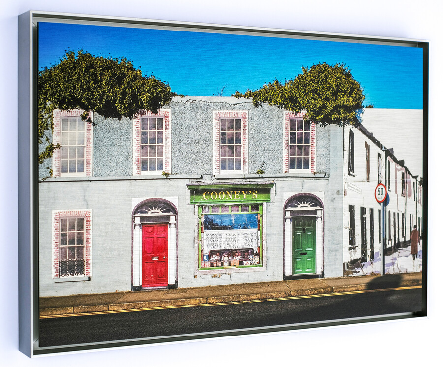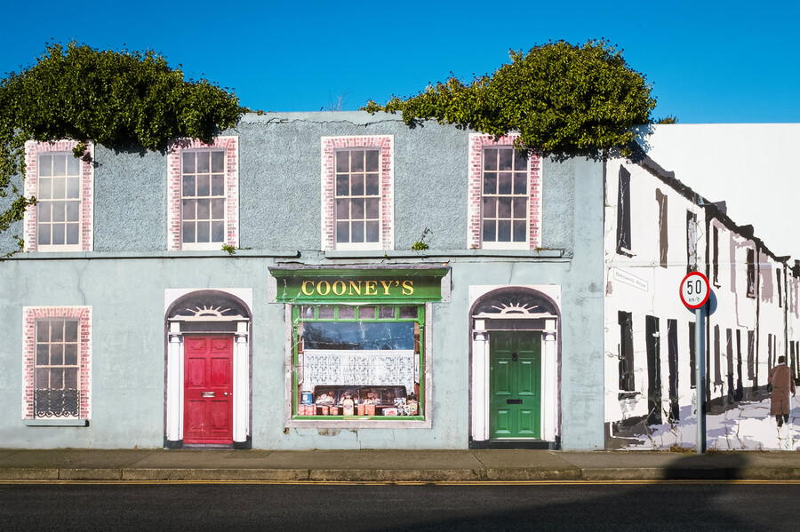 Cooney’s Treats’ is a nostalgic mural recreating a shop in a terrace in Dundalk, County Louth. The scene features brightly painted Georgian doors, fanlights, and sash windows, along with a glimpse of Browns Row, which once lead to the docks. Cooney’s shop window display of baked goods and sweets, set against net curtains, draws us in. The Racing Car Green colour of the shop was very popular in the past. There was one life here. Now it is just a mere facade.